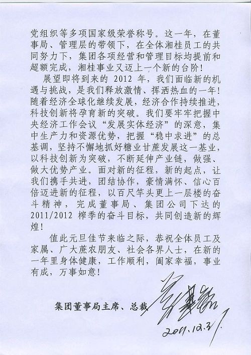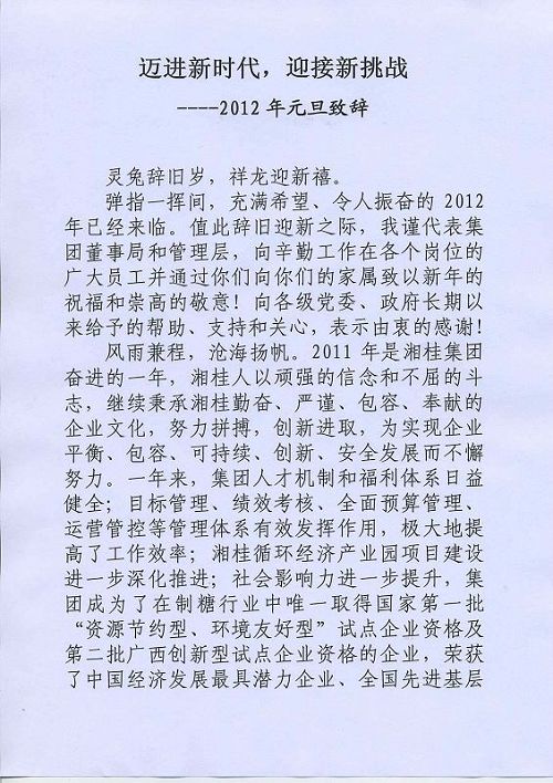 迈进新时代,迎接新挑战----集团董事局主席、总裁劳建铭先生2012年元旦致辞