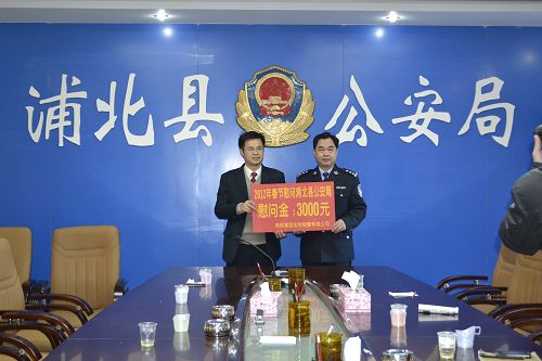 金和公司总经理罗成武(左一)向浦北县公安局赠送慰问金。