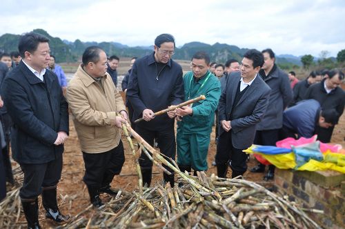 2月3日,自治区副主席陈章良一行在崇左市市长黄克、副市长雷海良、江州区区委书记邱明宏、区长陈光恩等的陪同下,到竞技宝竞猜公司孔香屯甘蔗种植示范基地调研指导。