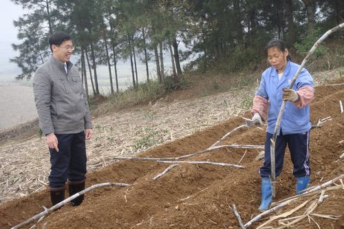 集团人力资源总监廖志林(左)了解农民种蔗进度。