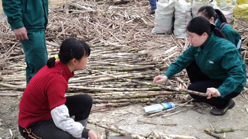 集团人力资源中心经理徐瑞芬(前右一)指导蔗农砍种、选种。