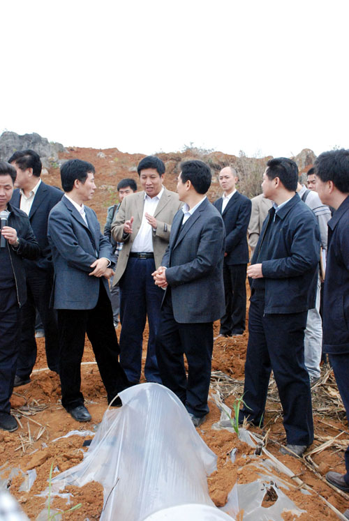 农水司司长王爱国(前右二)、崇左市副市长雷海良(前右一)在听取孔香示范片情况介绍。