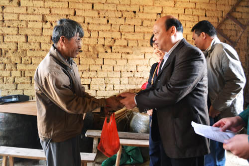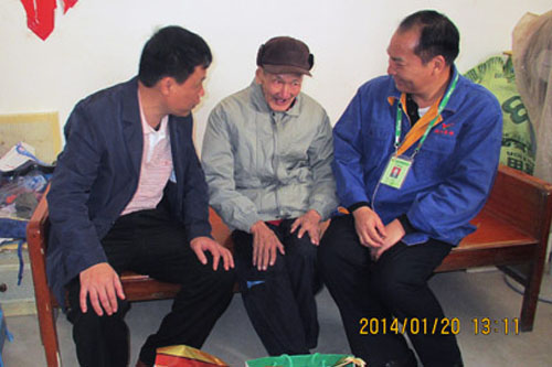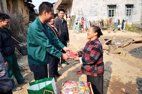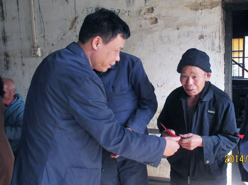 集团监事会监事长陈辉给敬老院孤寡老人送上慰问金。