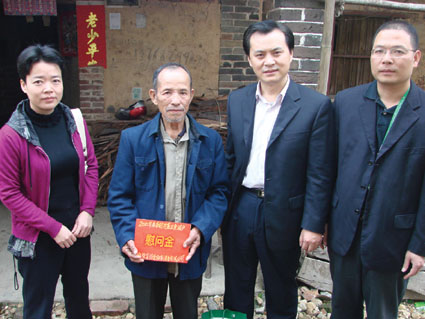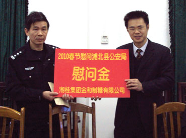 2010年新春佳节即将到来之际,1月20日、21日,集团董事、副总裁劳创禹、集团总裁助理黄春梅、金和公司总经理罗成武一行组成“送温暖、献爱心”慰问小组,会同当地政府相关领导分别对公司困难职工、蔗区蔗农、当地贫困户以及浦北县公安局、武警中队进行了新春慰问,并致以节日的问候以及送上慰问金和慰问品。