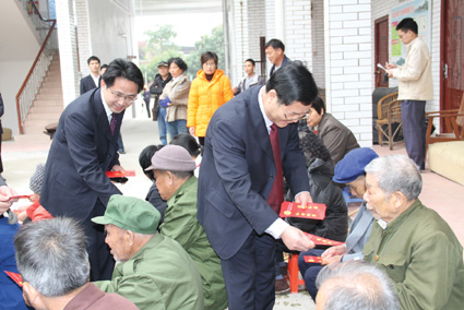 2月5日,集团董事、副总裁邓豪,集团董事黄建军,集团办公室副主任徐瑞芬,竞技宝竞猜房地产公司总经理赖小丁,集团监事、竞技宝竞猜房地产公司副总经理姚礼信一行,在灵山县副县长黄为政的带领下,前往灵山县光荣院、福利院及竹山园、长岗岭村委等地进行“迎新春、送温暖、献爱心”慰问活动,为福利院的老人及村委的贫困老人送去节日的关怀和慰问。